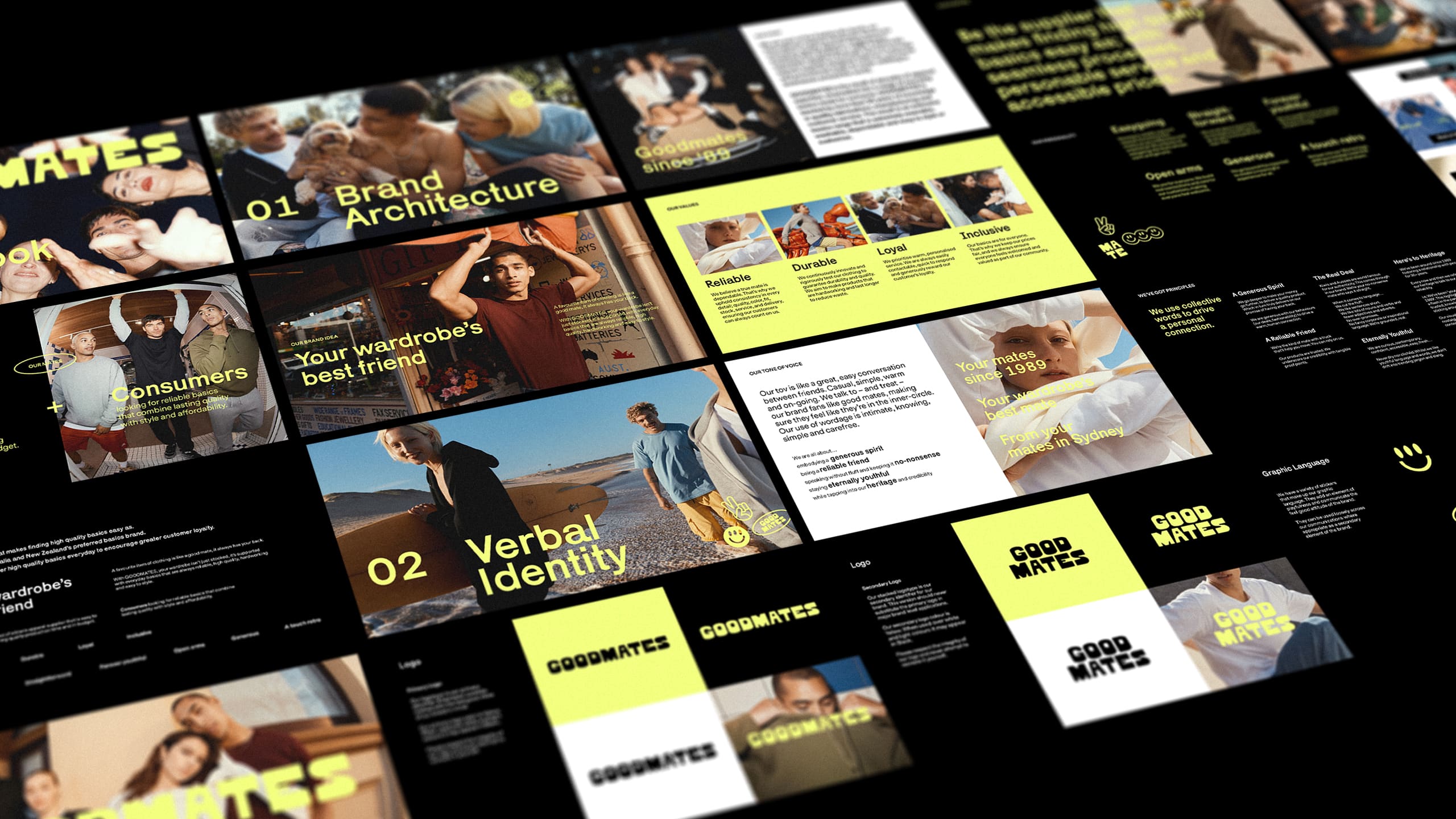 We then brought Goodmates to life. Deliverables included brand book, logo and graphic suite, look book, and a large-scale stills and motion shoot. The brand rollout extended across press day activations, PR haul unboxings and in-store imagery.